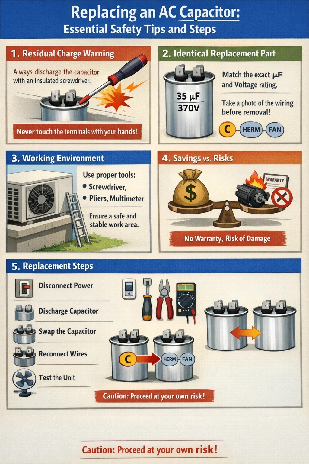 ওয়্যারেন্টি বাতিল: আপনার এয়ার কন্ডিশনার এখনও ওয়ারেন্টির অধীনে থাকলে, AC ক্যাপাসিটর নিজেই প্রতিস্থাপন করলে প্রস্তুতকারকের ওয়ারেন্টি বাতিল হয়ে যেতে পারে।