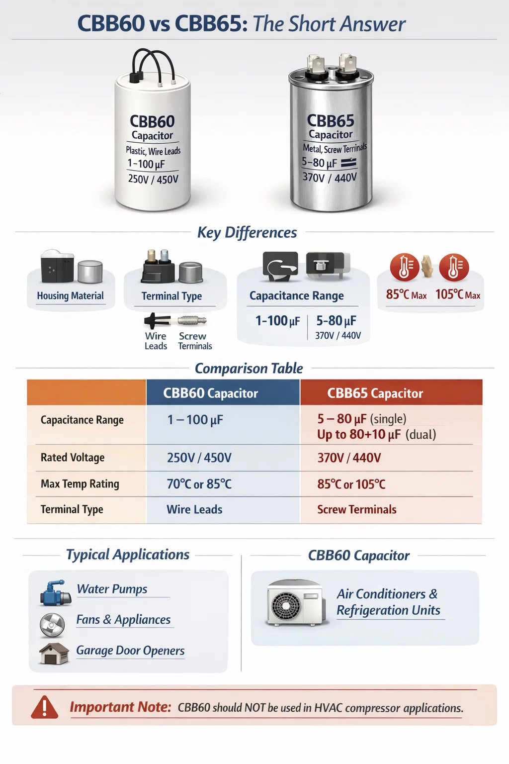 সংক্ষেপে: CBB65 বেশিরভাগ অ্যাপ্লিকেশনে CBB60-এর বিকল্প হতে পারে, কিন্তু CBB60 কম্প্রেসার অ্যাপ্লিকেশনগুলিতে CBB65-এর বিকল্প নয়।