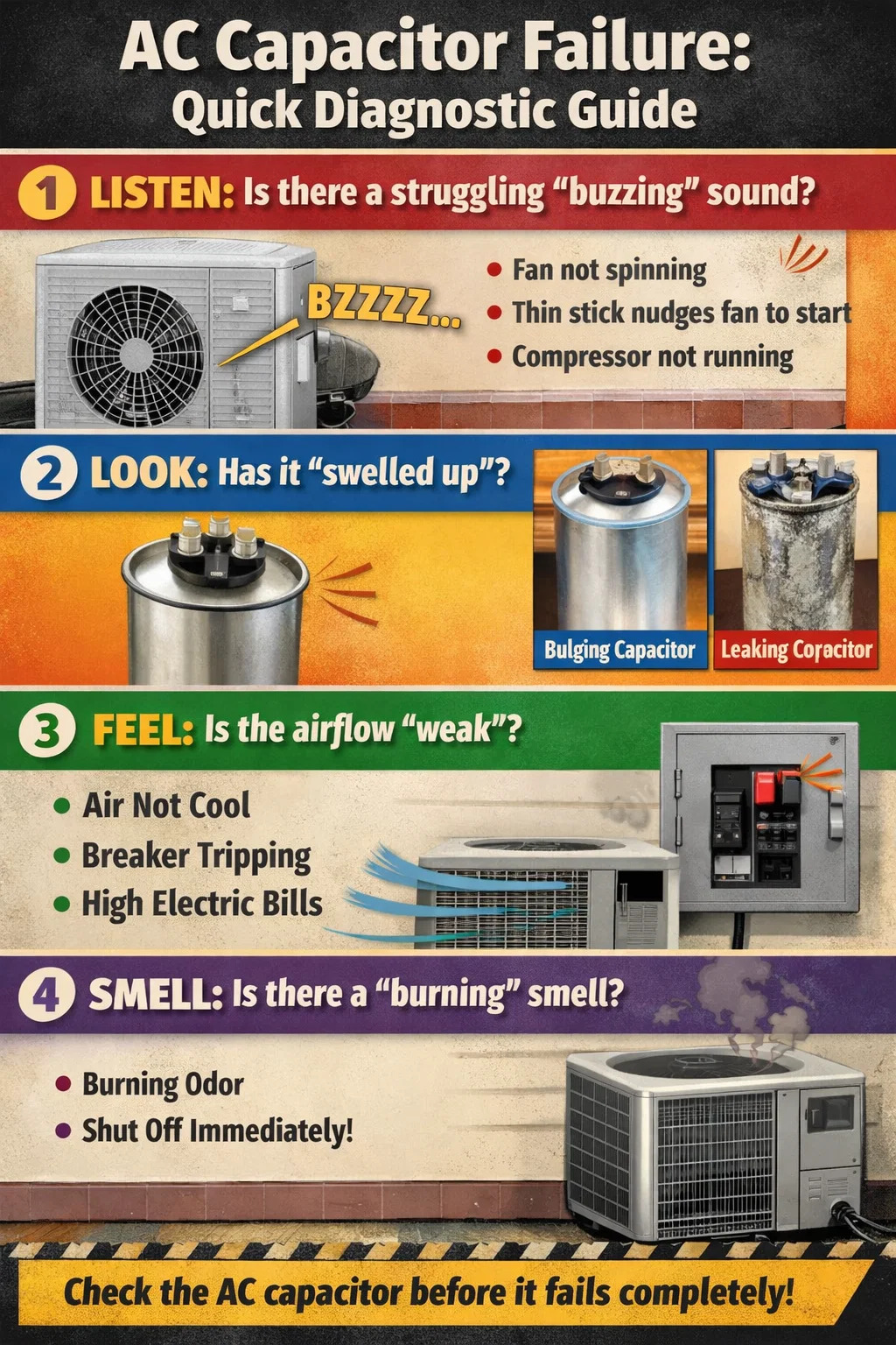 এয়ার কন্ডিশনারটির আউটডোর ইউনিটের কাছে, আপনি যদি জ্বলন্ত প্লাস্টিক বা তীব্র ধাতব গন্ধ পান, তবে এটি প্রায়শই AC ক্যাপাসিটর অতিরিক্ত গরম হওয়া এবং পুড়ে যাওয়ার পূর্বসূরি। এই ক্ষেত্রে, আপনাকে অবিলম্বে ইউনিটটি বন্ধ করতে হবে৷৷