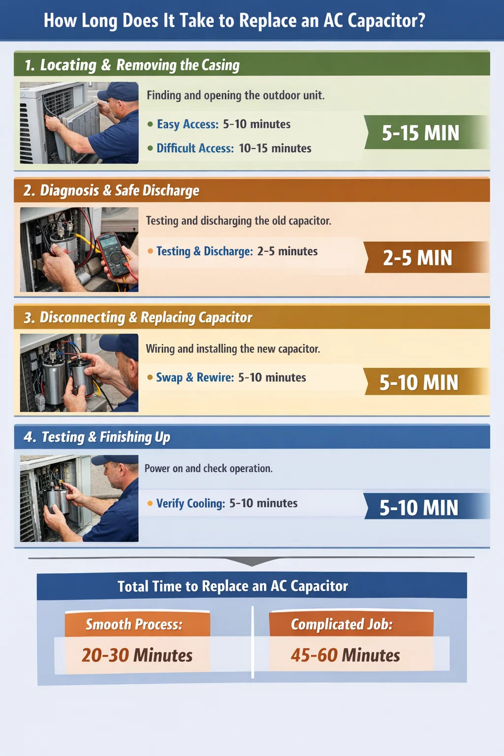 How long does it actually take to replace an এসি ক্যাপাসিটর ? আপনি যদি মাত্র কয়েক মিনিট টেকনিশিয়ান কাজ করছেন তা দেখেন, আপনি ভাবতে পারেন কাজটি আশ্চর্যজনকভাবে দ্রুত। কিন্তু টেকনিশিয়ান আসার মুহূর্ত থেকে যতক্ষণ না এয়ার কন্ডিশনার আবার ঠান্ডা বাতাস প্রবাহিত করছে, সেখানে একটি সম্পূর্ণ প্রক্রিয়া জড়িত।