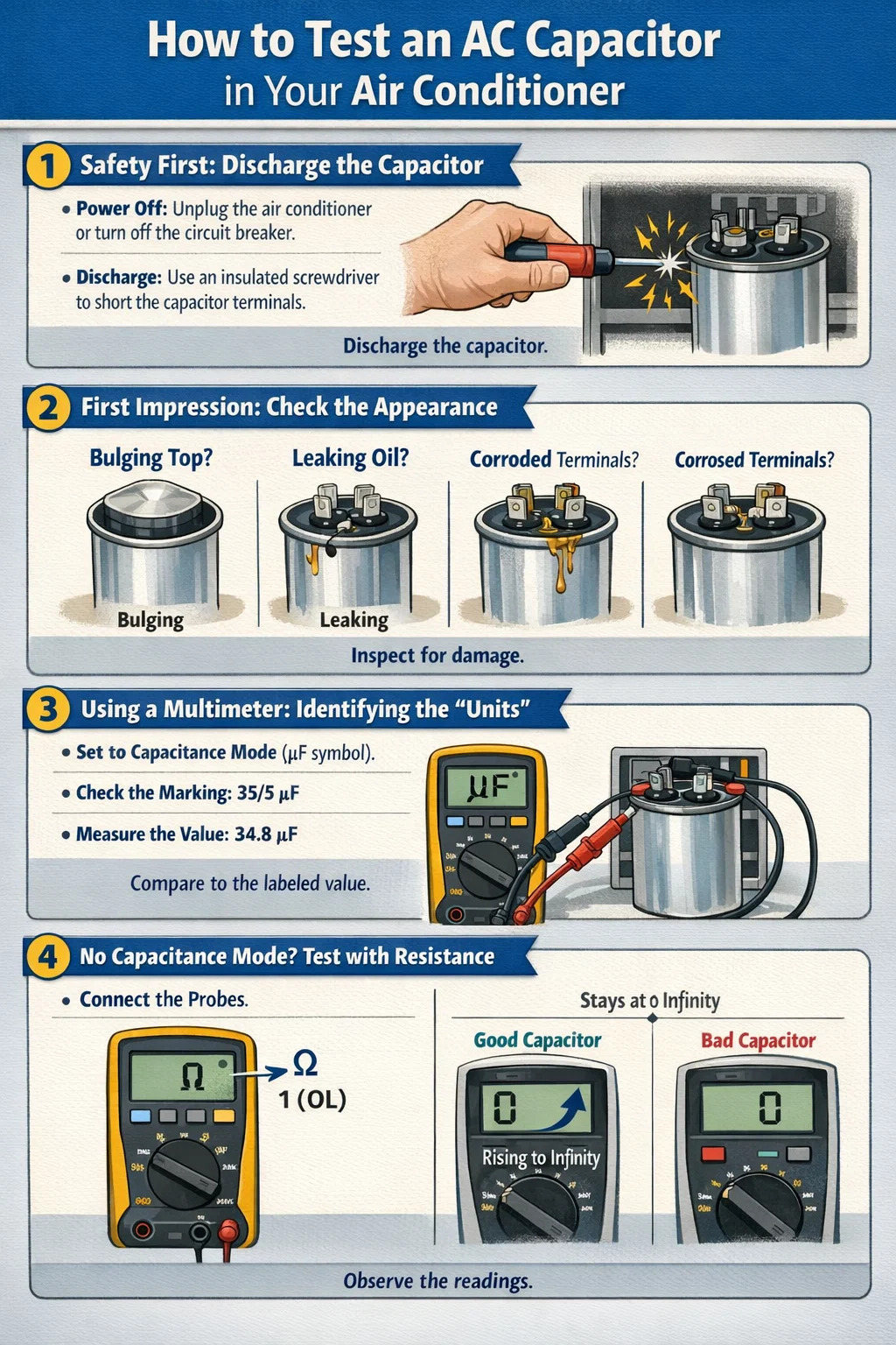 | খারাপ | রিডিং 0, শূন্যের কাছাকাছি, অথবা মিটার "OL" (ওপেন লুপ) দেখায়। | মৃত. ক্যাপাসিটর সম্পূর্ণরূপে ব্যর্থ হয়েছে। এসি ইউনিট চালু হবে না; অবিলম্বে এটি প্রতিস্থাপন. |