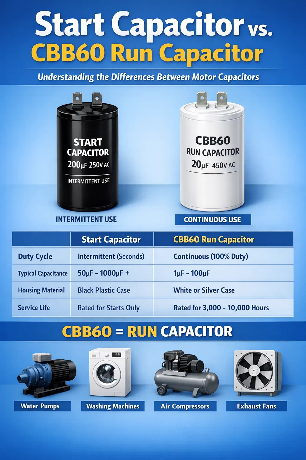 কার্যকরী পার্থক্য: স্টার্ট ক্যাপাসিটর বনাম CBB60 রান ক্যাপাসিটর