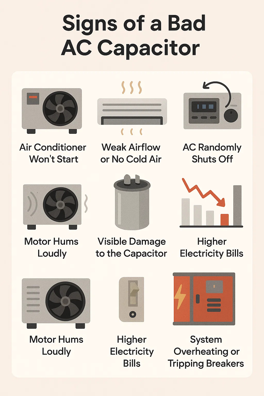 এখানে সাধারণ লক্ষণ আছে যে একটি এসি ক্যাপাসিটর খারাপ হতে পারে বা ব্যর্থ হয়েছে:
