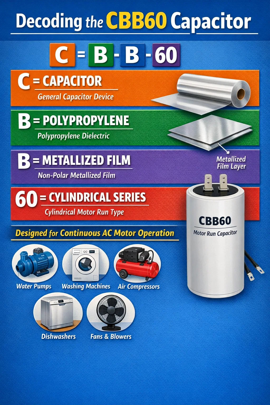 কোডটি নিজেই একটি আলফানিউমেরিক সংক্ষেপণ যেখানে প্রতিটি অক্ষর ডিভাইসের অভ্যন্তরীণ নির্মাণ এবং প্রয়োগ সম্পর্কিত একটি নির্দিষ্ট প্রযুক্তিগত ওজন বহন করে। স্টার্ট ক্যাপাসিটরগুলির বিপরীতে যা একটি মোটর গতিতে পৌঁছালে সার্কিট থেকে বের হয়ে যায়, CBB60 ক্যাপাসিটর স্থায়িত্ব এবং ক্রমাগত বৈদ্যুতিক শুল্ক জন্য নির্মিত হয়.