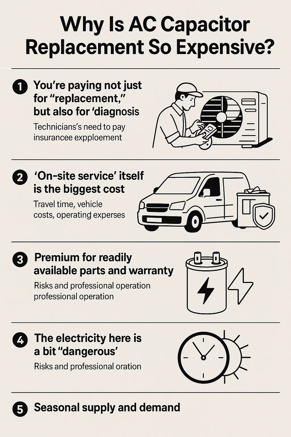 অনেক লোক যারা তাদের এয়ার কন্ডিশনার ক্যাপাসিটার প্রতিস্থাপন করেছেন তারা সম্ভবত অবাক হয়েছেন: কেন এই ছোট নলাকার অংশটি – এসি ক্যাপাসিটর - আমি যখন এটি অনলাইনে অনুসন্ধান করি তখন কি এত সস্তা, কিন্তু যখন কোনও প্রযুক্তিবিদ এটি প্রতিস্থাপন করতে আসেন তখন বিলটি কয়েকগুণ বেশি হয়?
